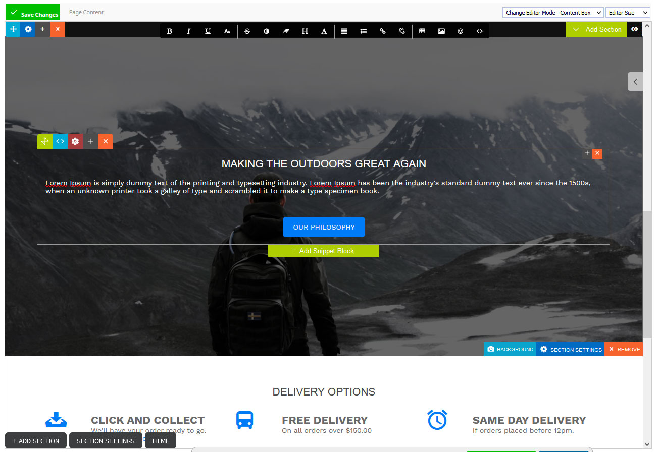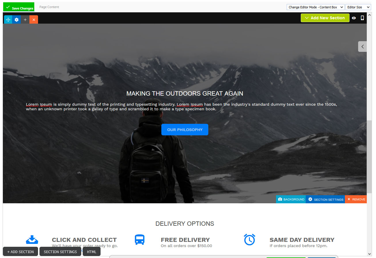 - Blue Cog Icon - Launch the Section Settings / Properties popup, change height, background settings etc...